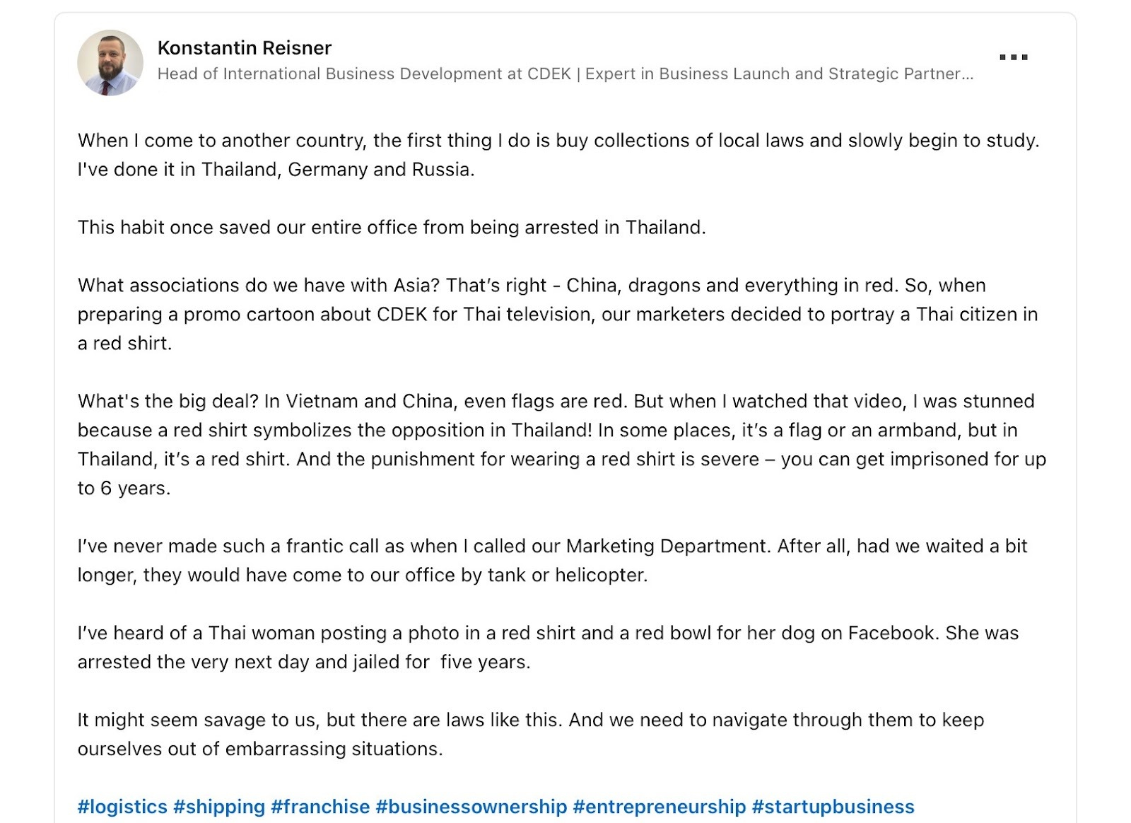 Аудитория активно откликалась на публикации Константина, которые содержали полезную информацию и практические рекомендации. Кроме того, посты в формате сторителлинга всегда привлекают внимание, особенно истории, где переплетается личное и профессиональное. Например, View Rate поста, почему нужно знать законы другой страны, составил 126,78%.