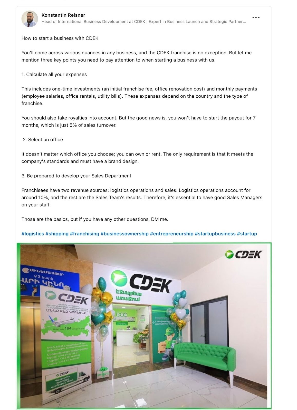 Высокие охваты в LinkedIn набирали кейсы франчайзи, аналитика по индустрии и публикации о масштабировании бизнеса. Например, View Rate поста о том, как стать франчайзи CDEK, был равен 132,96%.