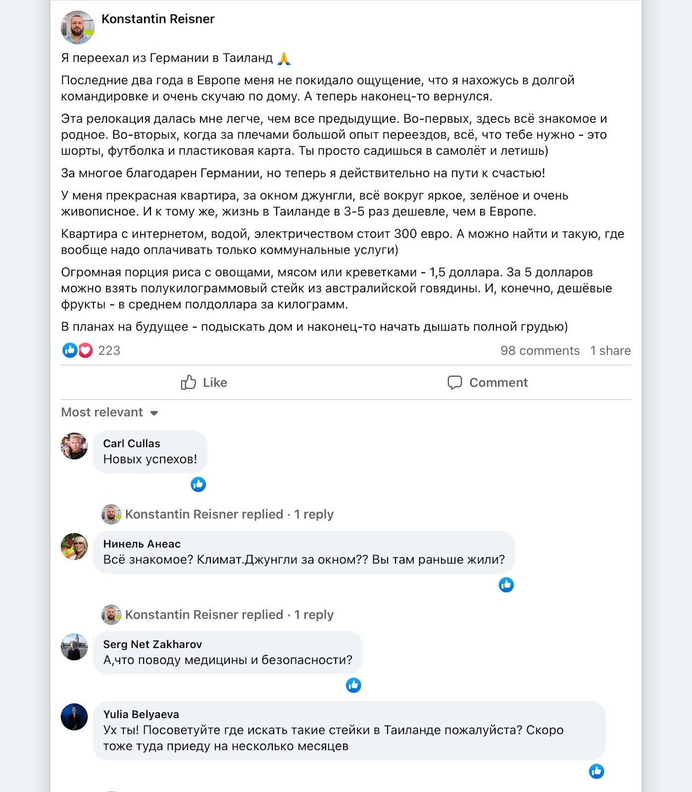 В Facebook мы сделали ставку на более личные, эмоциональные посты, которые вовлекают в диалог. Например, живую реакцию аудитории получила история Константина о его возвращении в Таиланд — 223 лайка и 98 комментариев (Engagement Rate 10,1%). Люди писали личные сообщения Константину, задавали бытовые вопросы о жизни в Таиланде и делились своим опытом.