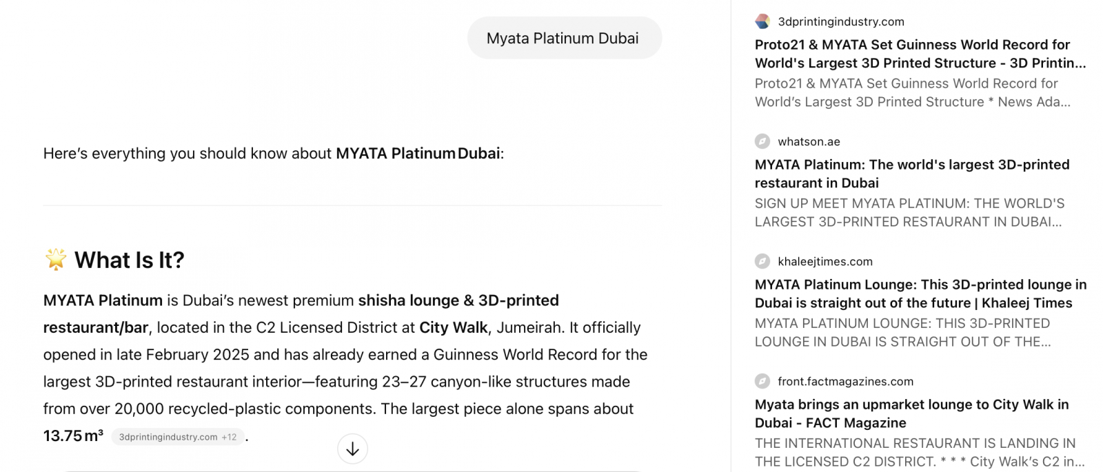 Ещё один пример: если попросить ChatGPT рассказать про нашего клиента, то он выдаст ответ, собранный из публикаций в СМИ о нем. Мы питчили статьи в 3D Printing Industry, WhatsOn и Khaleej times.