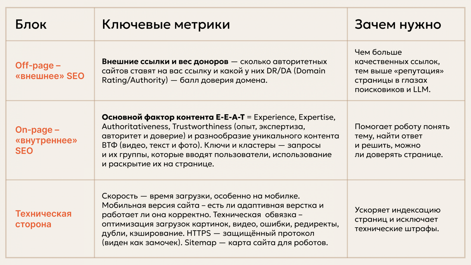 Google и Яндекс по‑прежнему ранжируют страницы по количеству ссылок, качеству контента и техническим метрикам. Но чтобы появиться в ответах нейросетей, бренд должен фигурировать в их датасетах — подборках авторитетных доменов. Если таких упоминаний нет, модель считает компанию малоизвестной и предлагает конкурентов.
