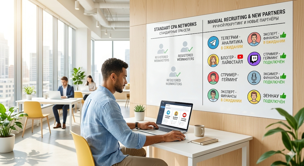 Большинство рекламодателей работают с партнерскими сетями по одной и той же схеме: подключились, запустили офферы, ждут трафик. Этот подход удобен, но у него есть принципиальное ограничение — вы видите только тех вебмастеров, которые сами зарегистрировались в сети. За ее границами остается огромный пласт блогеров, стримеров и авторов тематических каналов, которые либо никогда не слышали о партнерских программах, либо регистрировались когда-то и бросили. Именно эта аудитория становится источником нового трафика при правильно выстроенном ручном рекрутинге.