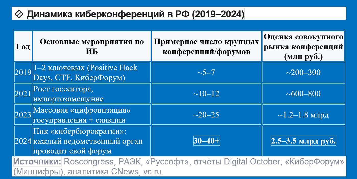 Хотя официальной статистики, прямо связывающей количество и доходы киберконференций с уровнем киберпреступности, в России нет (такие данные не агрегируются), мы можем реконструировать картину на основе открытых источников, отраслевых отчётов и наблюдаемых трендов.