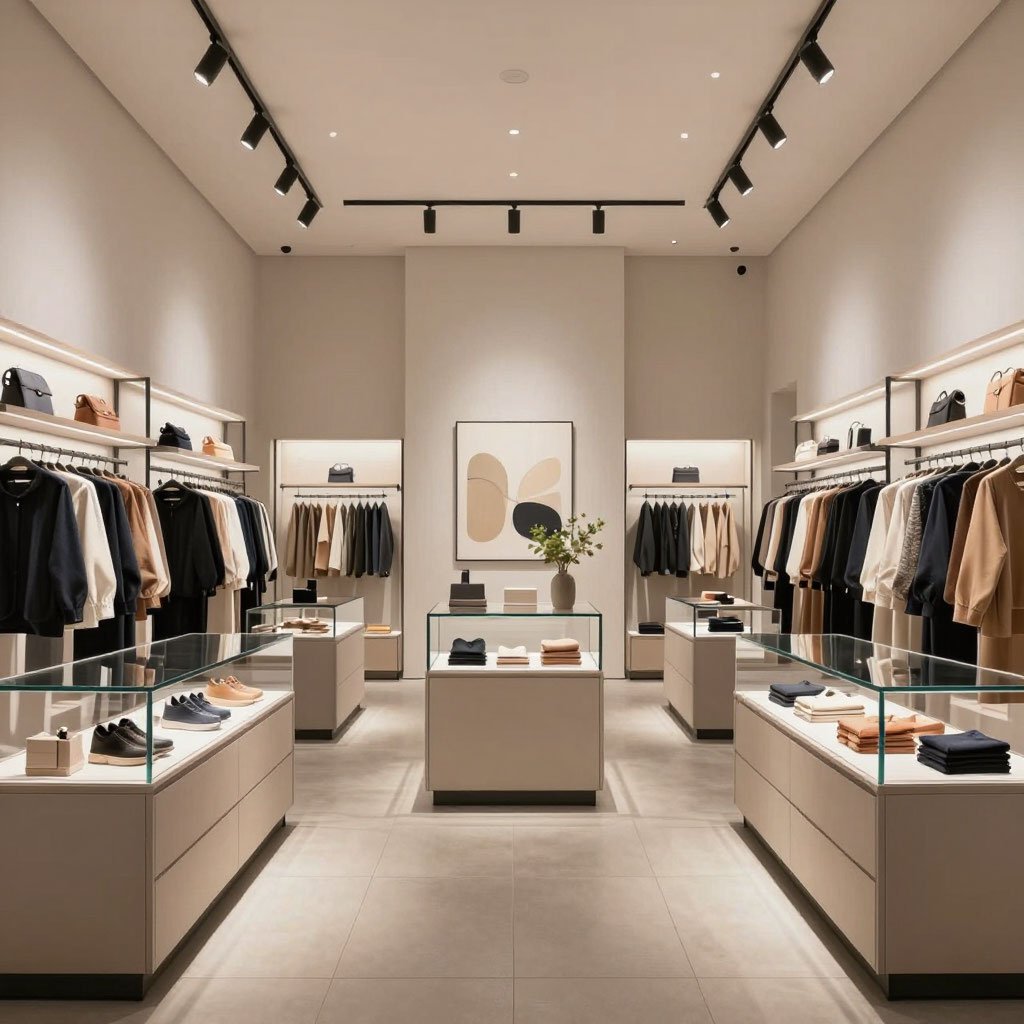 Практическое следствие для оборудования: деревянные элементы в конструкции стеллажей и витрин, открытые металлические каркасы вместо глухих панелей, интеграция подвесных модулей для растений. Оборудование становится частью дизайнерской концепции, а не просто функциональным носителем товара.