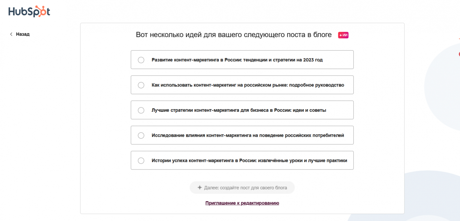 Сервис, который по введенным ключевым словам генерирует готовые идеи статей и постов. Он удобен для брейншторма: можно быстро собрать список тем на неделю или месяц и потом выбрать лучшие.