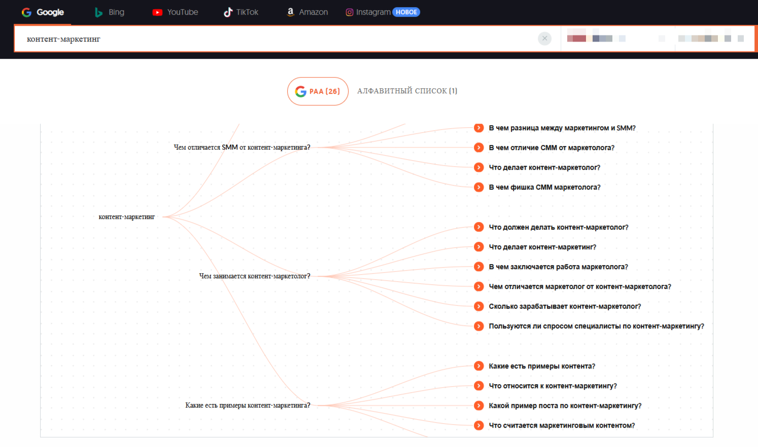 Инструмент собирает вопросы пользователей из поисковых систем и показывает их в удобной визуализации. Например, по слову «инвестиции» можно получить запросы «инвестиции для начинающих», «инвестиции в недвижимость», «как выбрать брокера». Из этих формулировок легко сделать статьи, чек-листы или пошаговые гайды. Поэтому сервис особенно полезен для поиска тем, которые точно соответствуют интересам аудитории.