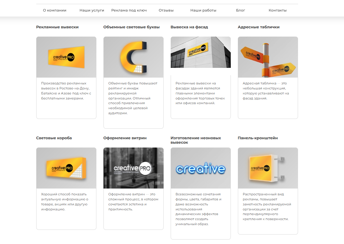 Бывает так, что компания предлагает ограниченное количество видов рекламы. Например, только вывески. Чаще всего такой бренд не стремится расширять структуру сайта, хоть и рассчитывает на поисковое продвижение. В этом случае можно смело привлекать сеошников, причем еще на стадии веб-разработки. Это называется SEO-проектированием.