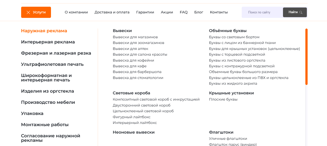 Например, у вас есть услуги: печатная реклама и световая реклама. Для каждой категории вы делаете подразделы. В световой рекламе это могут быть лайтбоксы, объемные буквы с подсветкой, неоновые вывески, а в печатной — баннеры, билборды, постеры и так далее.