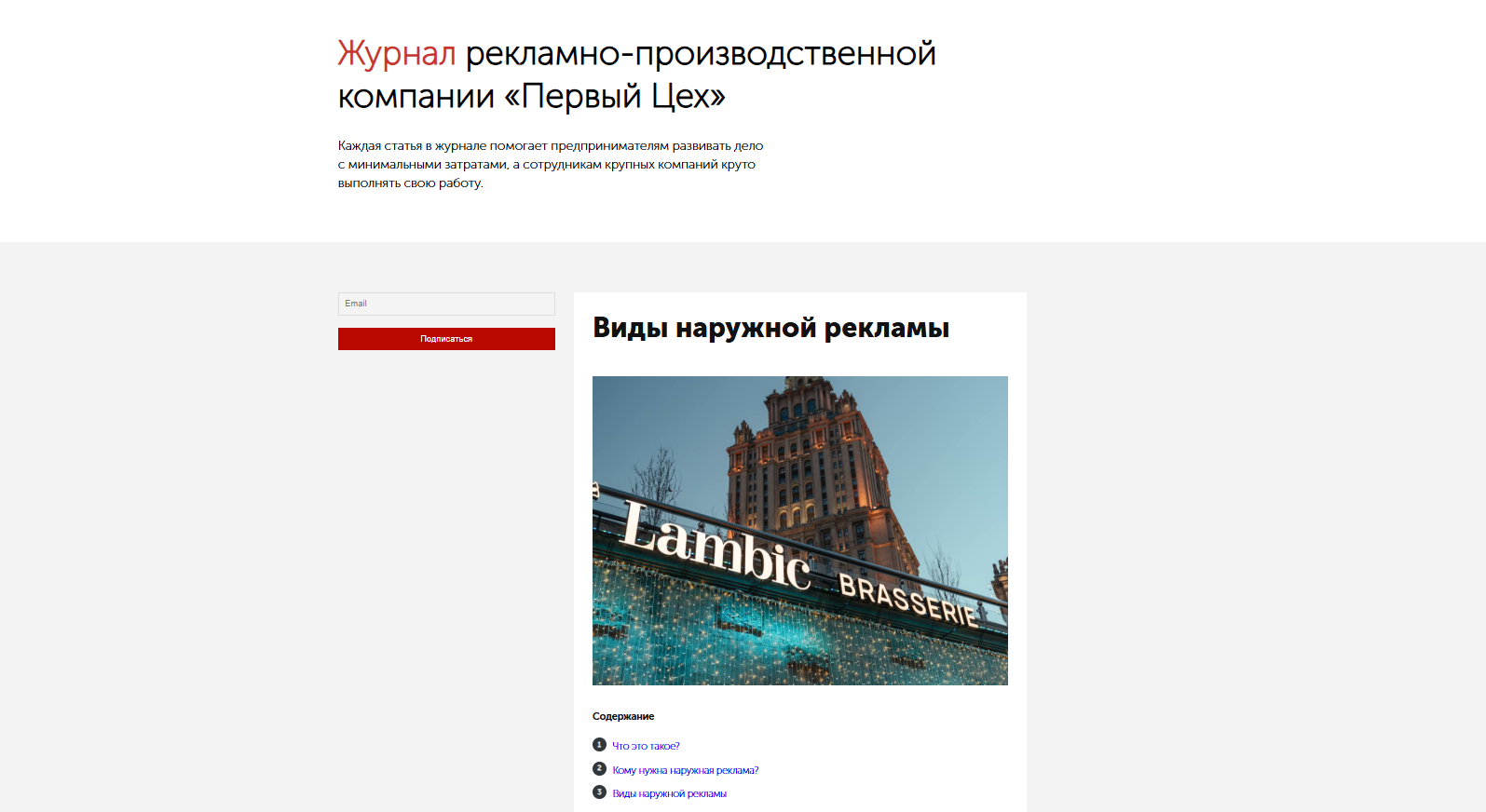 Дело в том, что многие клиенты в сфере наружной рекламы сначала ищут общую информацию по теме и лишь потом определяют подрядчика. Статьи помогают закрывать подобные смешанные интенты: «как выбрать материал для баннера», «какие виды вывесок бывают» и так далее. А когда блог спроектирован так, чтобы при этом ненавязчиво рассказывать о себе и подводить пользователя к странице услуг или к заявке, шансы превратить посетителя сайта в заказчика возрастают.
