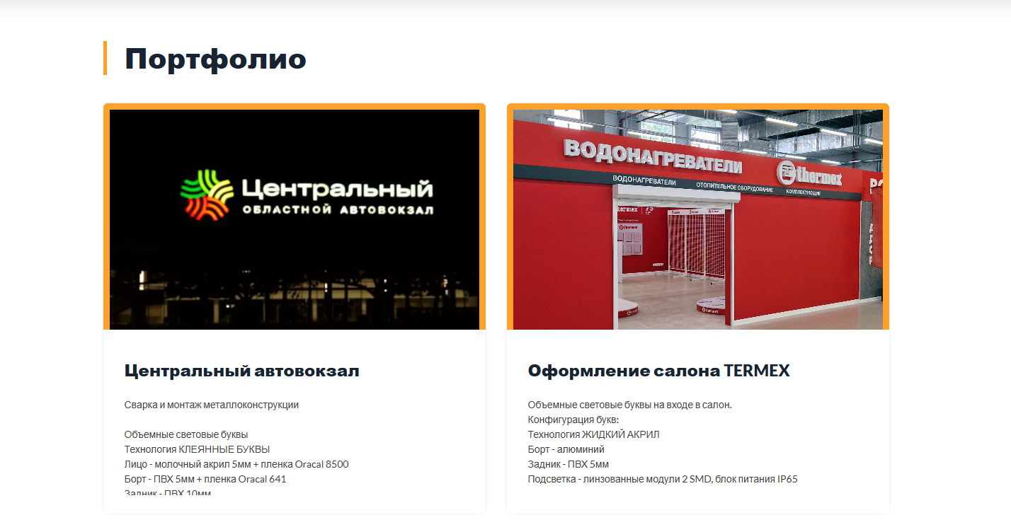 В наружной рекламе результат всегда наглядный — готовые конструкции. И часто компании ограничиваются визуалом, то есть делают портфолио на сайте. При этом изображения легко оптимизировать для попадания в поиск по картинкам. Но можно пойти дальше. Если вы добавите на сайт оптимизированные текстовые кейсы о работе с клиентами, то получите новые точки входа по низкочастотным, но максимально целевым запросам от пользователей.