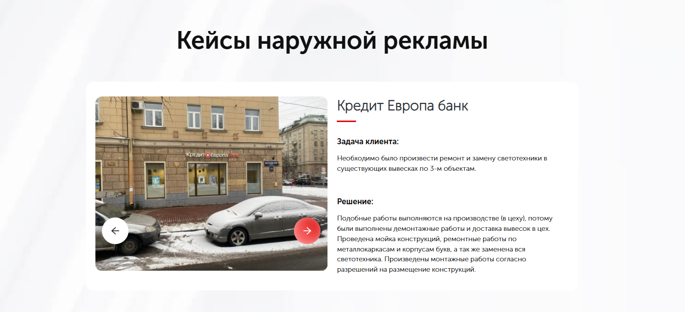 На страницах с кейсами можно размещать много полезной информации: задачи клиента, процесс производства, нюансы площадки для монтажа. Обязательно указывайте технические детали рекламы: размеры, материалы, сроки изготовления.