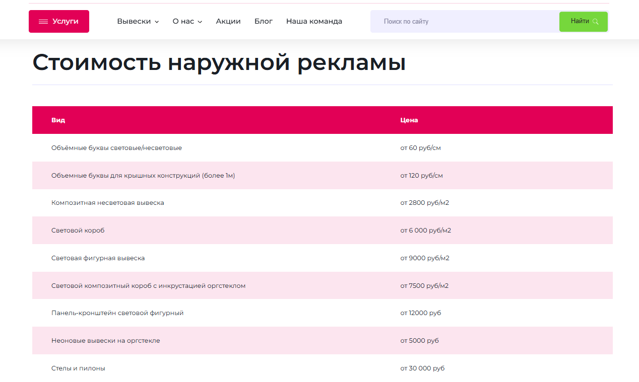 «Стоимость рассчитывается индивидуально» — такую фразу можно встретить на множестве сайтов. С одной стороны, это действительно так: бюджет на наружную рекламу зависит от материалов, размеров, дизайна, технологий и так далее. С другой стороны, полное отсутствие ценовых ориентиров отпугивает и снижает конверсию. И если у конкурентов на сайте есть прайс-лист, а у вас нет, — выбор очевиден. Кроме того, страница с ценами — дополнительная точка входа на сайт. Запросы в духе «сколько стоит сделать вывеску», «стоимость объемных букве» довольно популярны.