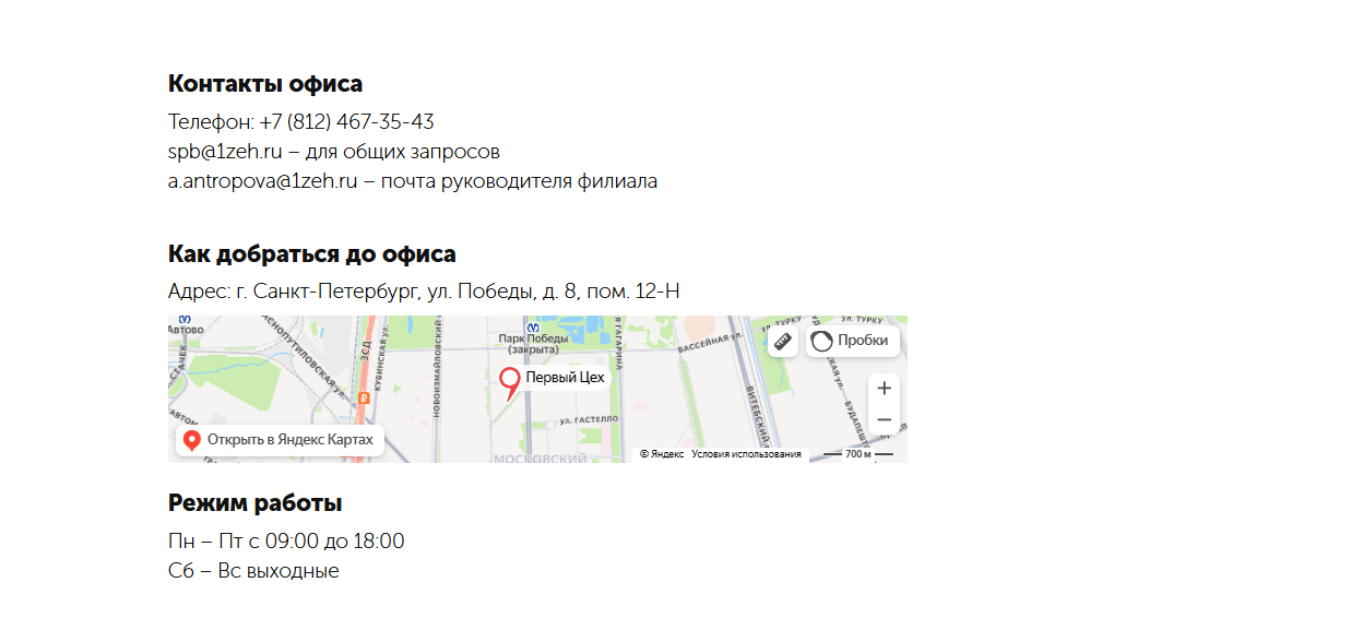 Дополнительно можно разместить интерактивную карту со схемой проезда. Параллельно работайте с «Яндекс Бизнес» и Google My Business, не забывая о профиле компании в соответствующих картографических сервисах.