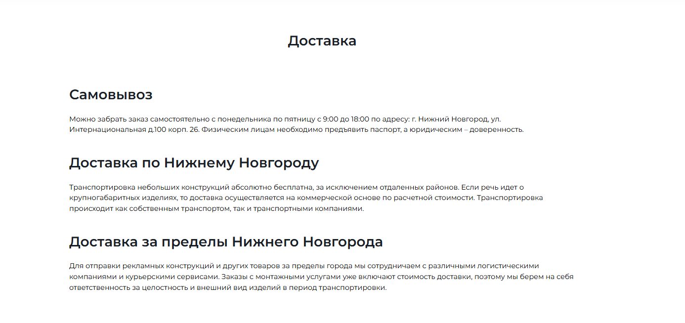 Поэтому обязательно добавляйте прайс-листы хотя бы для типовых проектов и услуг: цена печати за м², стоимость вывесок и коробов по размерам и так далее. Обязательно укажите, что входит в базовую стоимость, а за что нужна доплата: дизайн, доставка, монтаж, срочность.