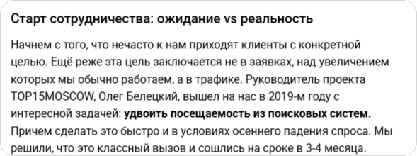 Большинство кейсов выглядят одинаково: «К нам обратился клиент с задачей поднять трафик». Такая подводка ничего не объясняет. Она не отражает, что происходило в бизнесе и почему проблема вообще возникла. Без контекста кейс теряет ценность: он перестает отвечать на вопрос, зачем компании понадобилась внешняя экспертиза.