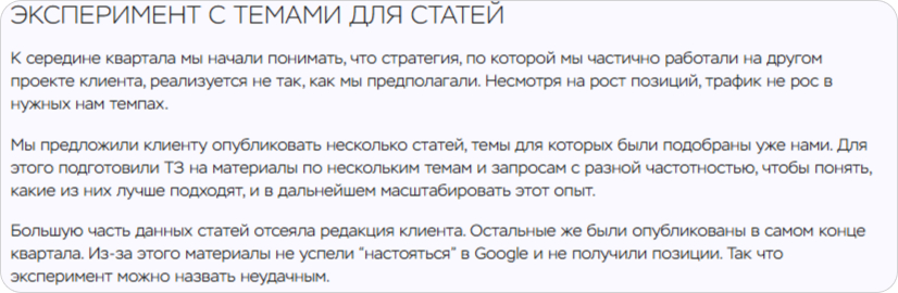 Кейсы, где всё выглядит идеально, плохо работают на доверие. Когда история идет ровно — от первого шага до блестящего результата — создается ощущение, что проект был без рисков, а успех получился сам собой. В реальности всё иначе: любой процесс состоит из гипотез, проб и ошибок.