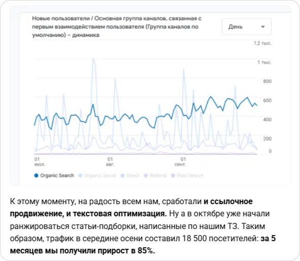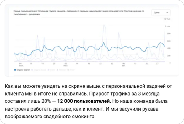 Когда вы открываете процесс мышления, кейс становится живым и убедительным. Например, команда отказалась от прямых запросов, потому что пользователи редко искали продукт напрямую, и сместила стратегию на косвенные триггеры. Такой фрагмент сразу показывает уровень экспертизы: видно, что вы анализируете поведение аудитории, ищете нетривиальные точки роста и работаете не по шаблону.