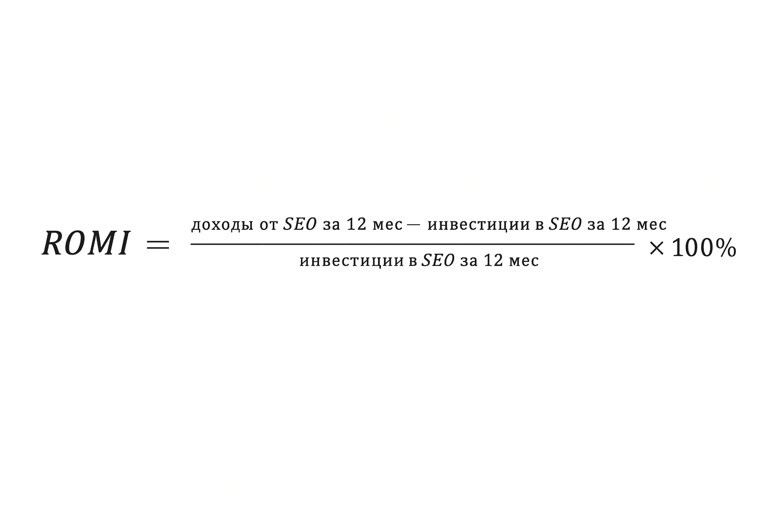Возвращаемся в реальность и вспоминаем, что SEO — долгосрочная инвестиция. Результатов от оптимизации в первые 6–12 месяцев может и не быть. Так что оптимальный срок для анализа рентабельности — год. Поэтому для расчета ROMI от SEO мы немного изменим стартовую формулу. Теперь она будет выглядеть так:
