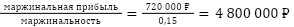 Чтобы достичь точки безубыточности, агентству нужно получить за год маржинальную прибыль в те же 720 000 ₽. Если маржинальность бизнеса — 15%, можно рассчитать, какой выручки должно быть достаточно: