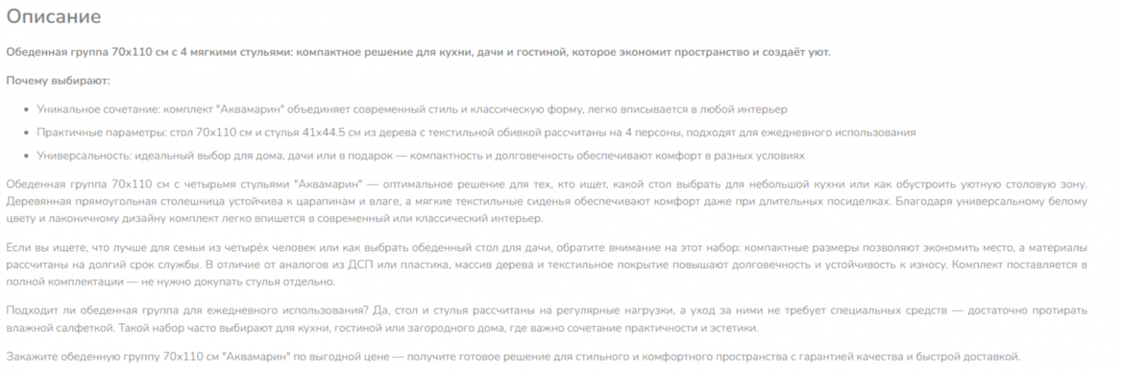 Карточки в онлайн-каталогах частенько уходят в крайности: либо это сухой набор характеристик без объяснений, либо длинный текст с общими словами, из которого покупатель не выносит практической пользы. В обоих случаях контент не помогает принять решение, а значит, магазин теряет заказы. Ведь именно на странице товара пользователь определяется, покупать ему продукт или закрывать вкладку.