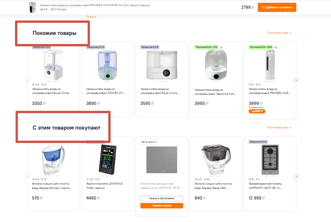 Блоки «С этим покупают» и «Похожие товары» удерживают потенциального клиента на сайте. В первом случае карточка подсказывает логичное продолжение покупки. Смартфон сопровождается чехлом и защитным стеклом нужного размера или беспроводными наушниками, детская коляска — дождевиком и подстаканником, куртка — шапкой и шарфом в цвет мембранной тканью. Во втором случае пользователь видит альтернативы с понятными отличиями: дороже, но теплее, компактнее, но с меньшей автономностью, без шумоподавления, но с более легким корпусом.