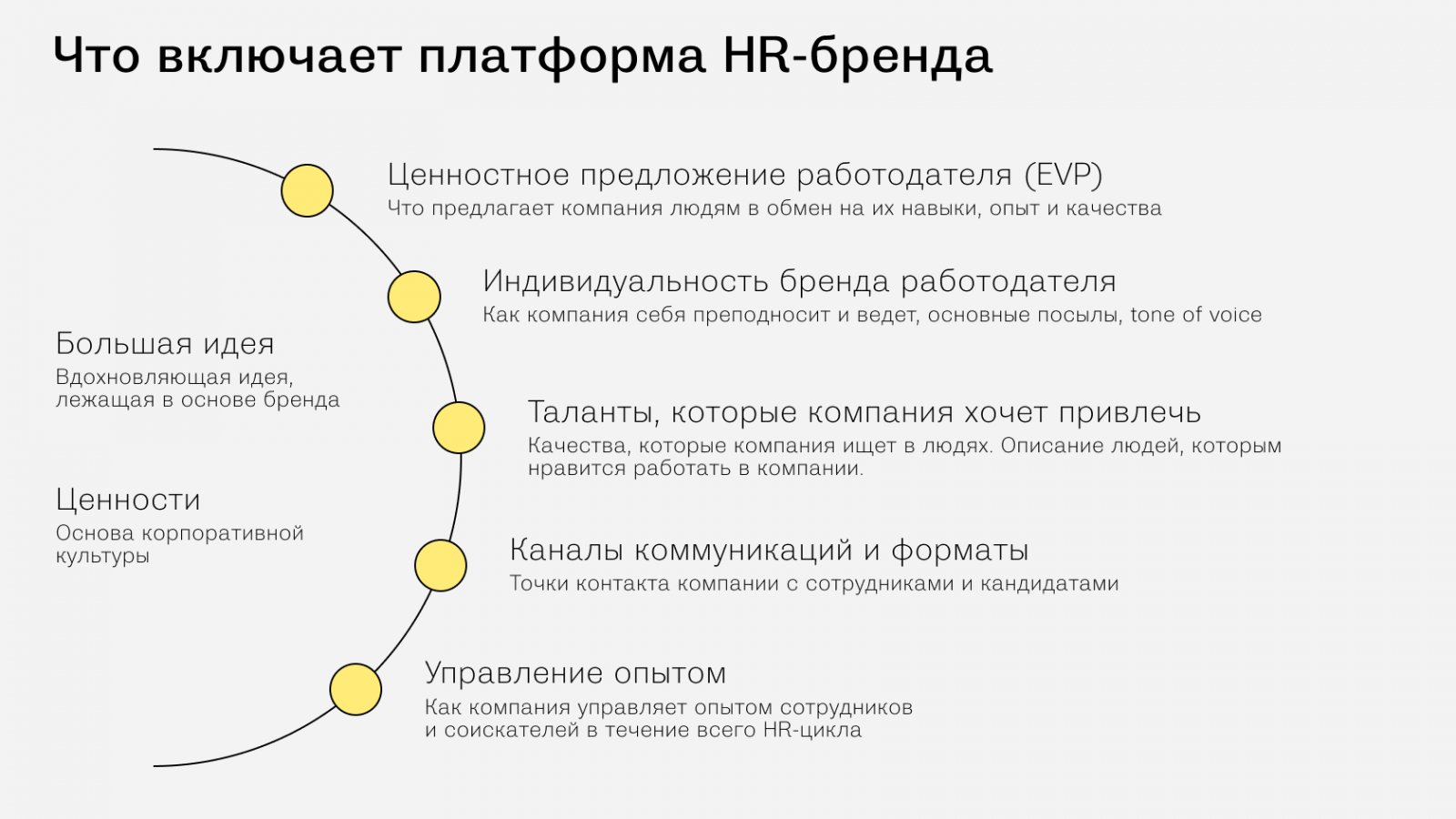 Сестричка бренд-платформы, но не её близняшка. То есть — они похожи, но у каждой есть свои особенности.HR-платформа фиксирует EVP, каналы и форматы коммуникаций с сотрудниками — становится «путеводной звездой» для управленческих решений и прочей внутрянки.