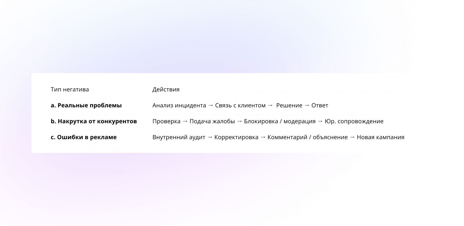 Параллельно мы организовали трёхуровневую систему отработки негатива — в зависимости от его источника и характера: