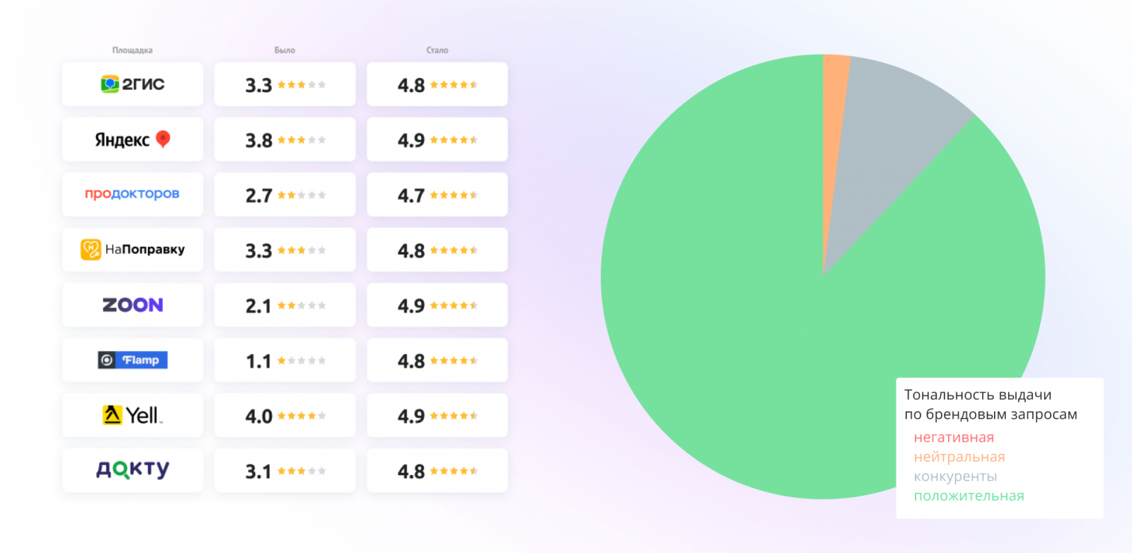 В итоге — результаты, превзошли все ожидания клиента. Средний рейтинг по всей сети вырос с 2,9 до 4,8.