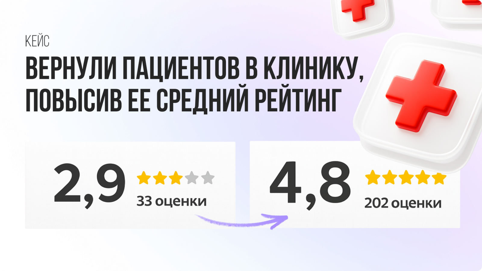 94% пациентов считают репутацию ключевым критерием при выборе медучреждения, 78% выбирают только те клиники, чей рейтинг не ниже 4 звезд из 5, и, наконец, 35% россиян ищут клиники через геосервисы (Яндекс Карты, 2ГИС, Google Maps). Отсюда вопрос: будут ли люди доверять свое здоровье клинике со средним рейтингом 2.9?