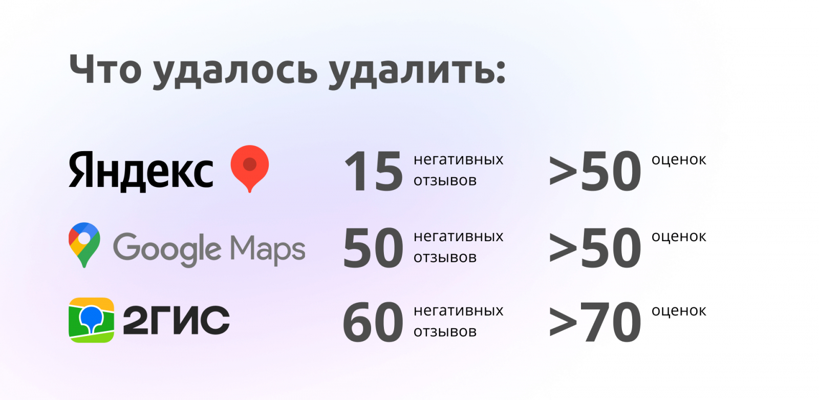 Когда стало ясно, что ответы не помогают (большинство комментариев писались «по слухам», а не по факту), мы перешли к работе с площадками и начали системное удаление нарушающих правил отзывов и оценок: