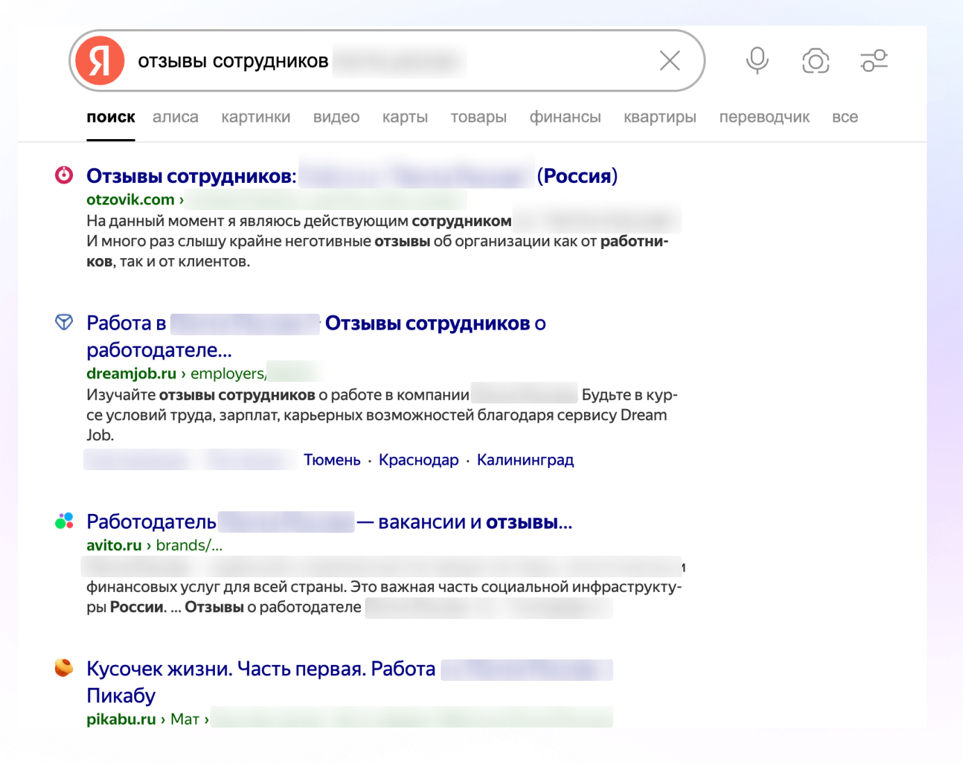 А там Dream Job, hh.ru, «Отзывы сотрудников», «Правда сотрудников». Если в этой выдаче сплошной негатив человек просто закроет вкладку. И вероятность отклика адекватного специалиста на вакансию будет стремиться к 0.