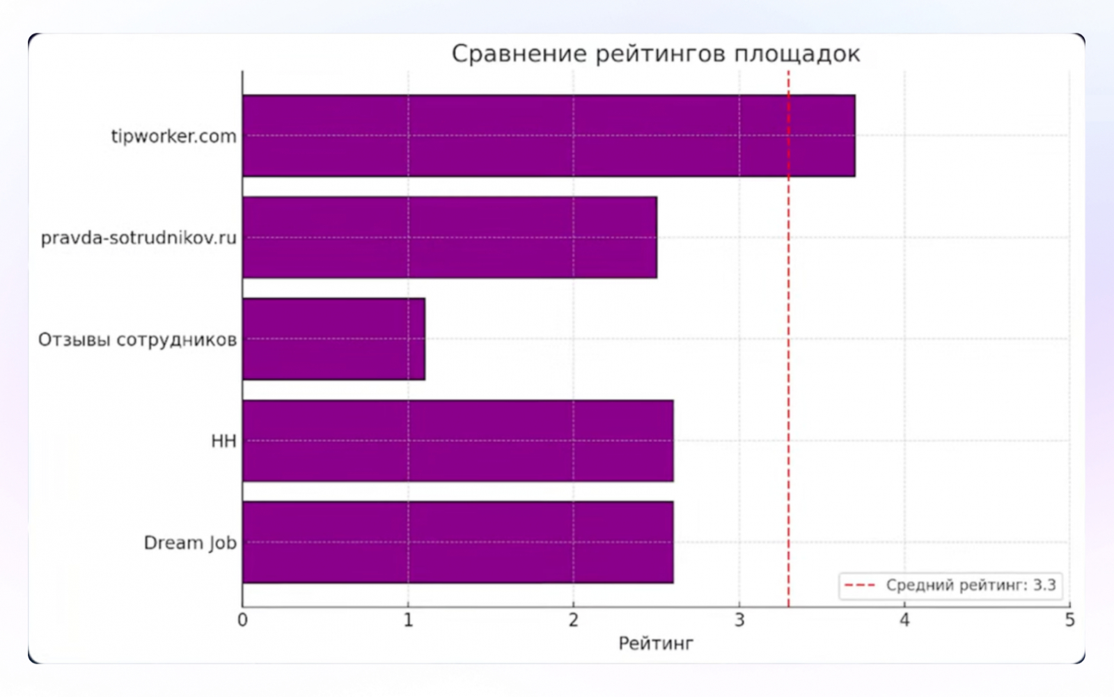 Начнём с найма. Компании с сильным HR-брендом получают на 50% больше заявок и снижают затраты на подбор на те же 50%. Но это общая статистика. На практике всё начинается с рейтингов на площадках, где вы размещаете вакансии.