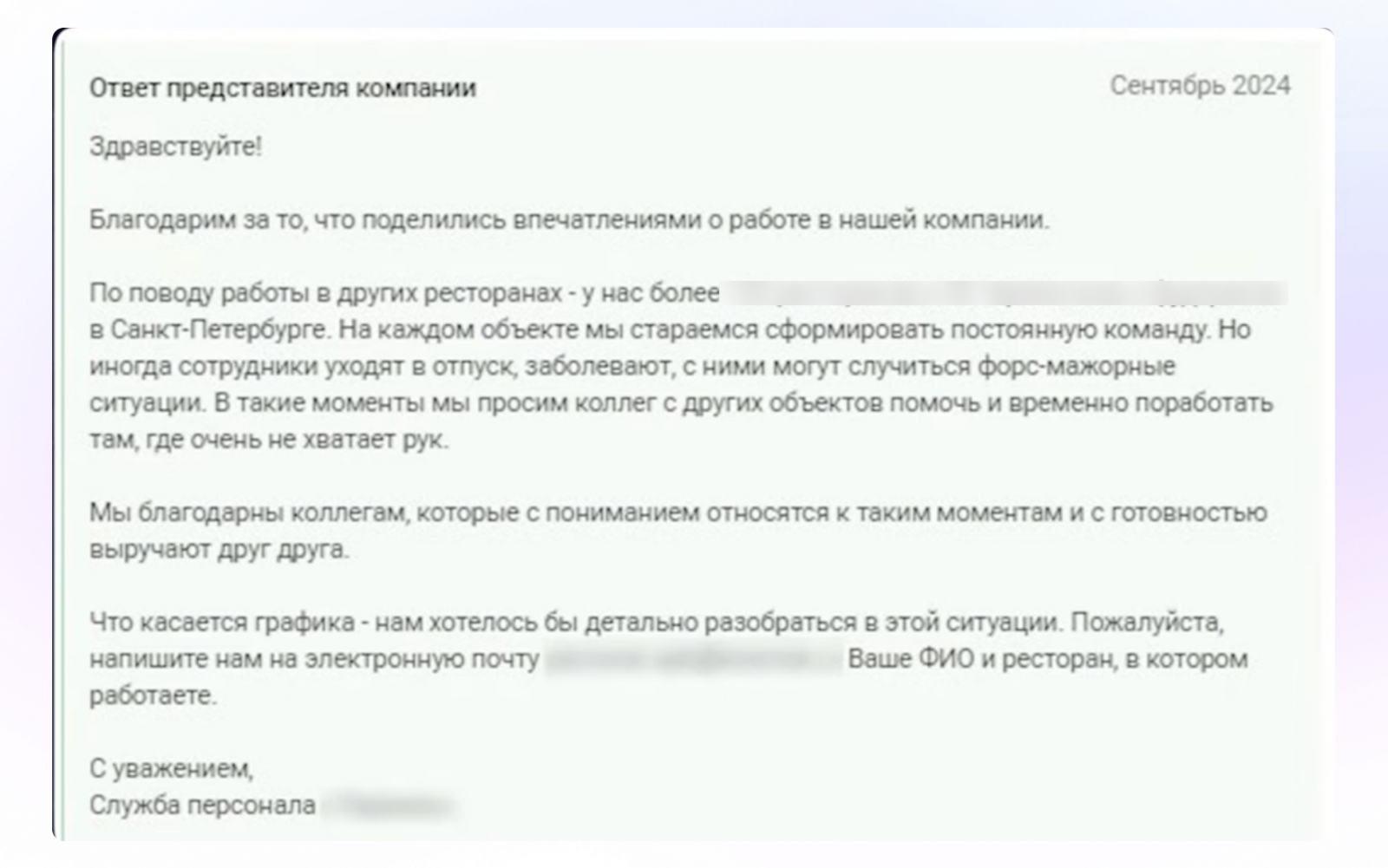 Первое, что нужно делать — это реакция от официального лица компании. Реагируем, отвечаем, показываем заинтересованность и то, что мы готовы решить проблему наших сотрудников. Потому что оставленный негативный отзыв не всегда означает, что сотрудник уволился. Важно понимать: он может находиться в компании и просто накапливать токсичность внутри себя, распространять ее в коллективе или элементарно выгорать. И мы можем реально потерять очень ценного сотрудника.