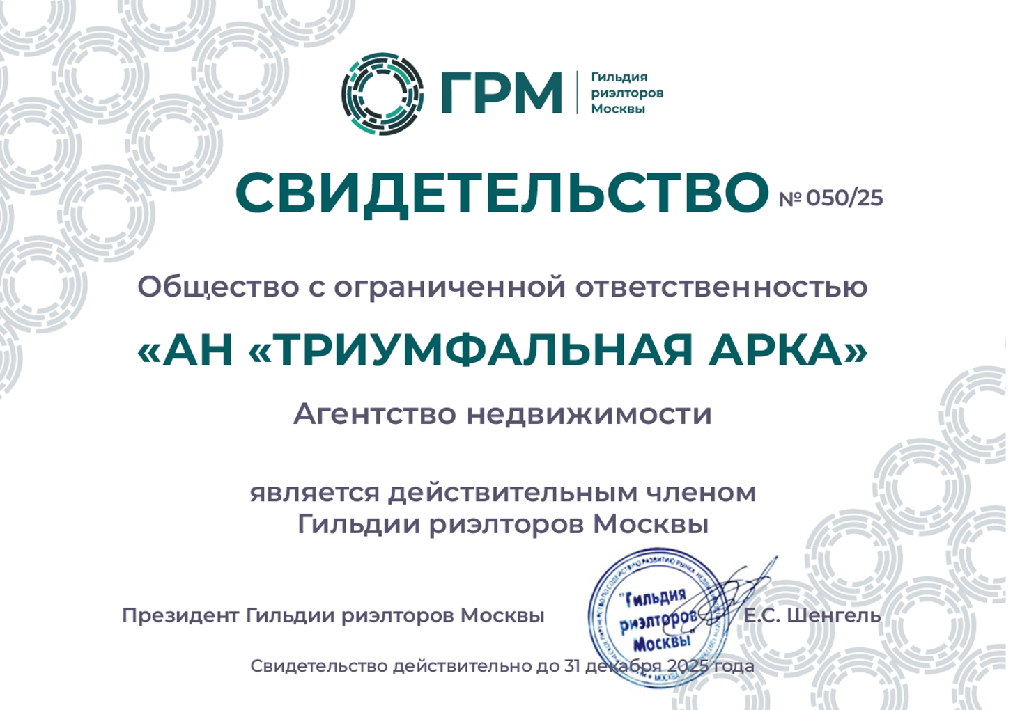 Наше агентство, «ТРИУМФАЛЬНАЯ АРКА», на добровольной основе проходит аттестацию ГРМ и уже более 20 лет является членом Российской Гильдии Риэлторов. Участие в гильдии накладывает морально-этические обязательства на нашу деятельность и показывает, что мы развиваемся и еще больше повышаем качество оказываемых услуг по купле-продаже недвижимости в Москве. Это значит, что наши риэлторы, работают в соответствии с принципами ГРМ и могут быть уверены в своей профессиональной репутации, а клиенты – в защите своих прав и интересов.