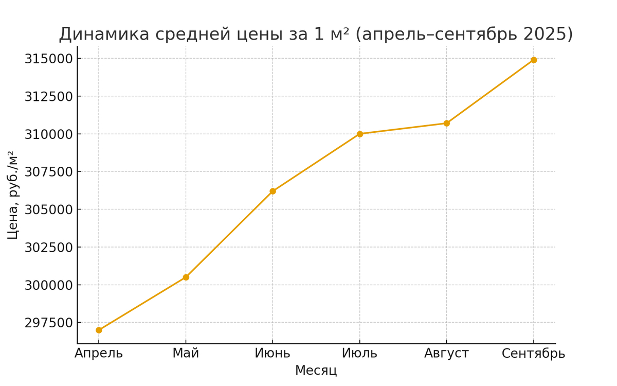 По данным Комитета ГРМ по статистике и аналитике, с апреля по сентябрь 2025 года средняя цена «квадрата» на вторичном рынке Москвы выросла на около 6 %, достигнув 314 909 руб. за 1 м² к концу сентября.