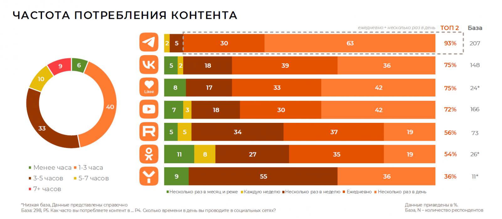 Современные подростки сидят в соцсетях довольно много — 3-5 часов в день — но у них нет ярко выраженных лидеров мнений, которым они посвящают всё это время. Внимание подростков «дробится»: например, они могут потратить час на просмотр подкаста от любимого блогера, полчаса — на общение в Telegram-чате и еще полтора часа — на короткие видео. При этом, у них нет «любимого» канала потребления контента, которому они безоговорочно доверяют.