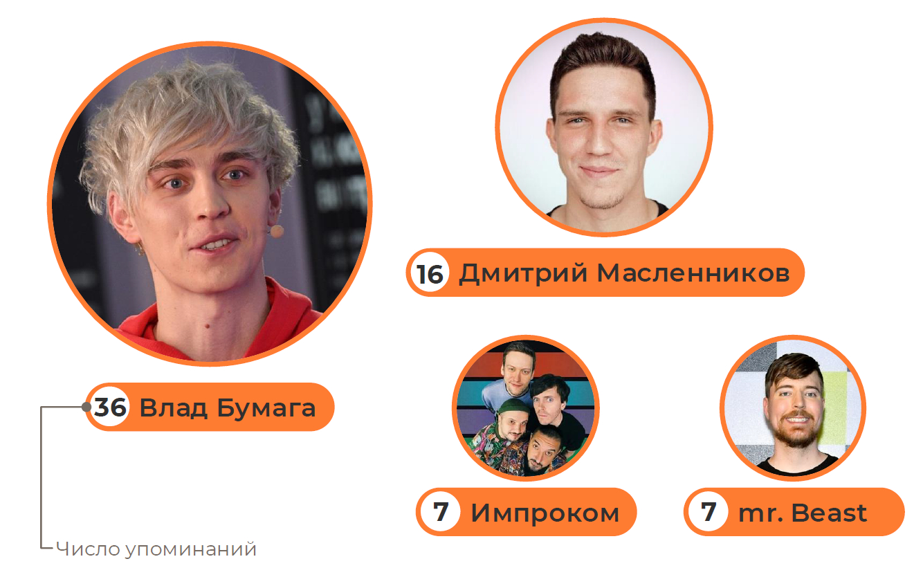 То же самое касается и блогеров — нельзя выделить топ инфлюэнсеров, за которыми следят абсолютно все подростки. Конечно, есть наиболее популярные блогеры, которых знают многие школьники — например, это Влад Бумага, Дмитрий Масленников, mr. Beast или компания «Импроком». Но, например, в нашем опросе они не заработали и 50% упоминаний. Из 248 опрошенных подростков 199 назвали совершенно других инфлюэнсеров, при этом ни разу не повторившись.