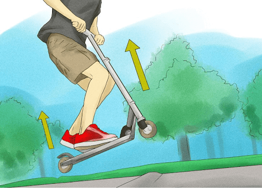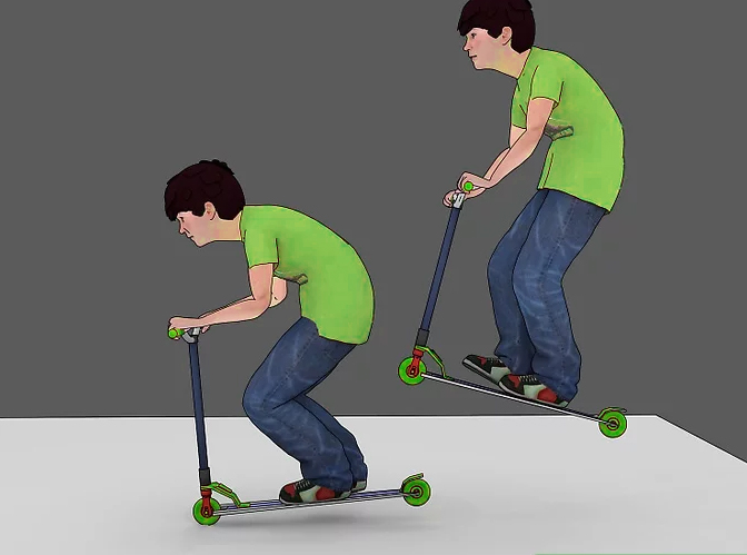Как делать: Делаешь хоп, но сначала тянешь руль вверх, чтобы оторвалось переднее колесо. Затем, уже в воздухе, подтягиваешь заднюю часть, как будто "зачерпываешь" ногами. Самокат должен выровняться параллельно земле. Приземляйся плавно.