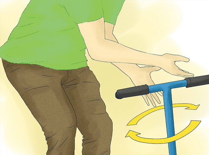 Как делать: Делаешь хоп, в воздухе бросаешь руль одной рукой, вращаешь его и ловишь перед приземлением.