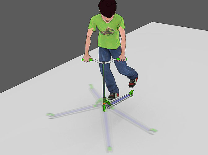 Как делать: Перенеси вес на переднее колесо, поставив переднюю ногу ближе к рулю. Задняя нога чуть оттянута. Поверни голову и плечи в сторону разворота - самокат пойдет за ними. Оторви задние колеса и крути на 180 градусов.