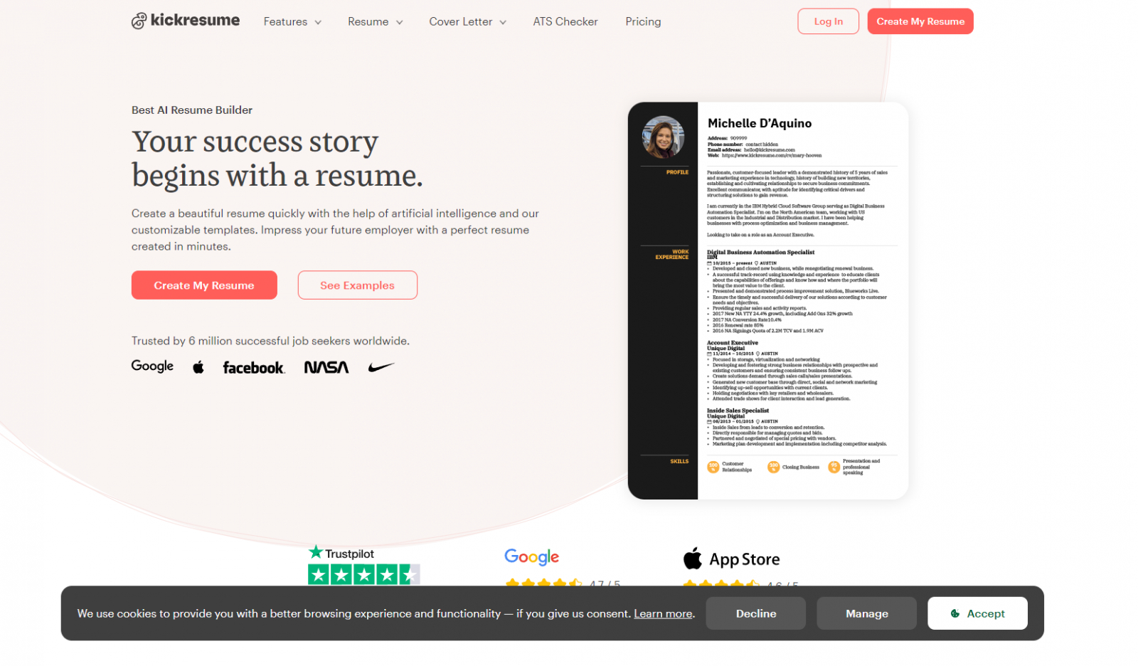 Kickresume.com – инструмент, предоставляющий максимально упрощенный вариант редактирования резюме. Набор опций минимален, зато на его освоение не потребуется тратить много сил, несмотря на английский язык интерфейса. В бесплатном аккаунте доступен весь функционал конструктора, но количество шаблонов ограничено.