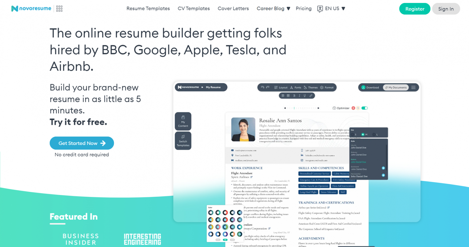 Novoresume.com – редактор с коллекцией шаблонов для работы над бланками, состоящими из нескольких листов. Однако в бесплатном варианте можно рассчитывать только на классическую одностраничную самопрезентацию. В ассортименте 16 дизайнов, но большая часть из них также доступна только по подписке.