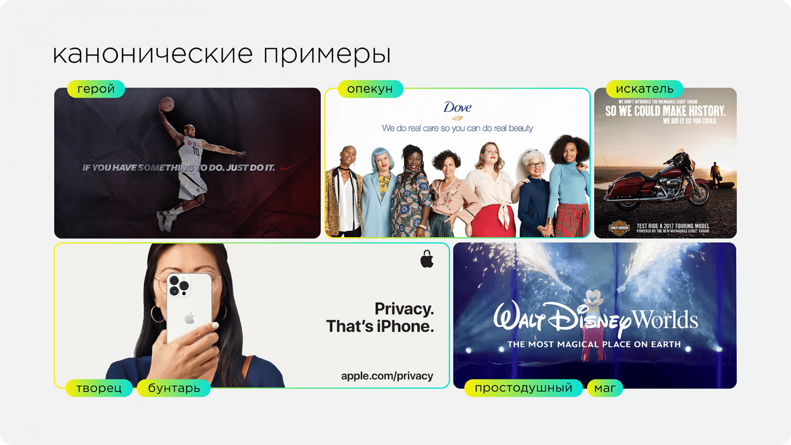 Канонические примеры: Nike (Герой) с его Just Do It, образами преодоления и победы. Apple (Творец/Бунтарь) с культом инноваций, дизайна и «думай иначе». Dove (Опекун) с миссией заботы о реальной красоте и самооценке. Harley-Davidson (Бунтарь/Искатель) с символикой свободы и бунта. Disney (Мечтатель/Маг) с созданием волшебных миров.