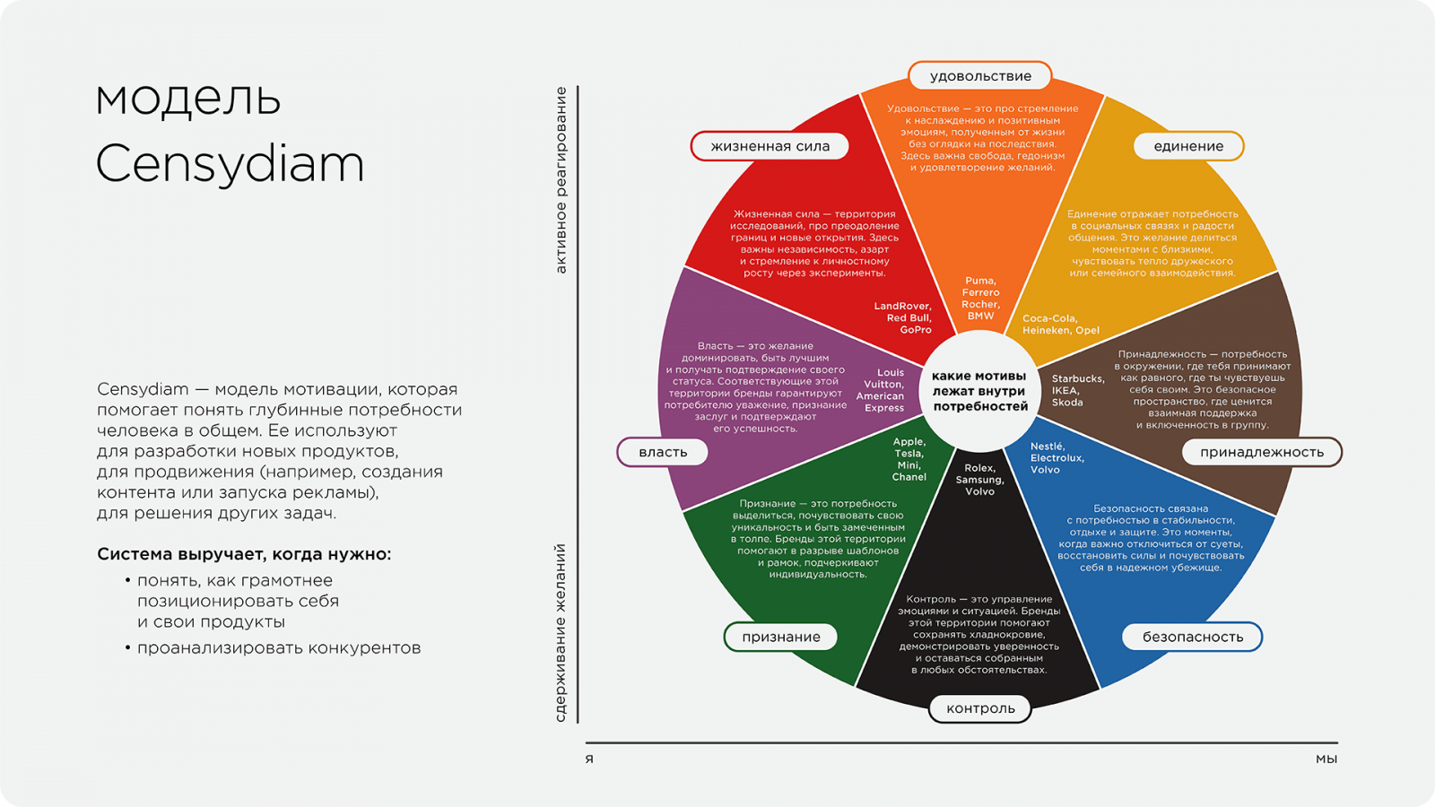 1. Важно определить коммуникационную территорию, например, используя модель Censydiam. Это такая модель мотивации, помогающая в общем понять глубинные потребности человека. Определив территорию вашего бренда, мы поймем, о чем и как он должен говорить со своей аудиторией.