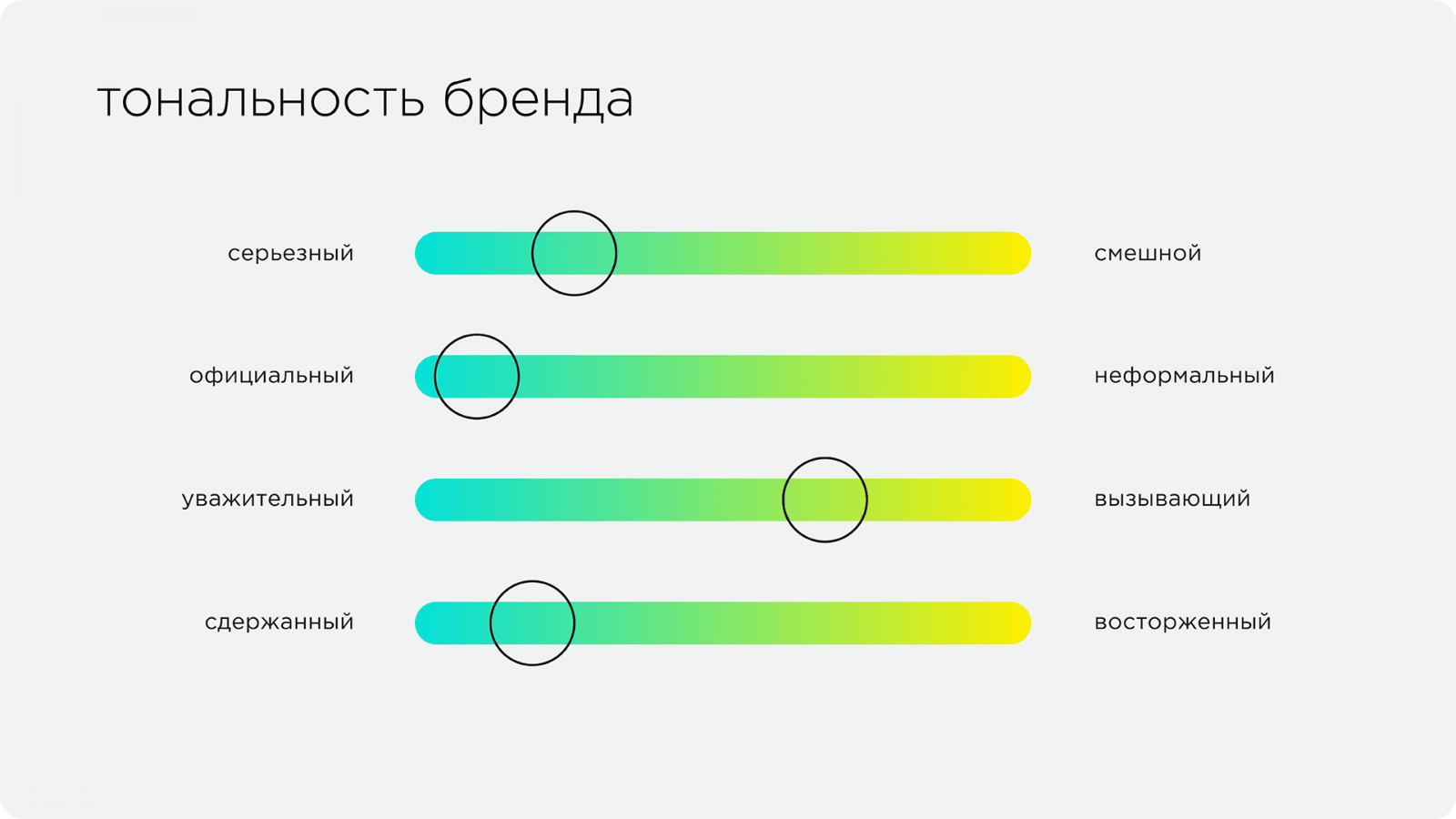 2. Нужно описать тональность — стилистику и настроение, которые определяют коммуникацию бренда через тексты, фото, видео, аудио, иллюстрации. Уточнить нюансы можно с помощью классификации Nielsen по четырем характеристикам: юмор, формальность, почтительность и энтузиазм.