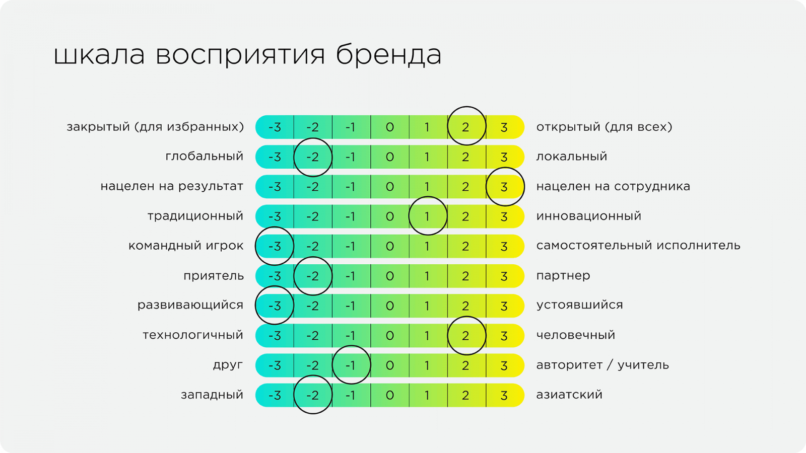 3. Еще следует сформулировать характер и ценности бренда. Здесь в ход идут различные практические инструменты: от глубинных интервью с членами команды и ЛПР до персонификации бренда, от модели идентичности Дэвида Аакера до простых контрастных шкал восприятий бренда и ассоциаций с животными или стилями архитектуры.