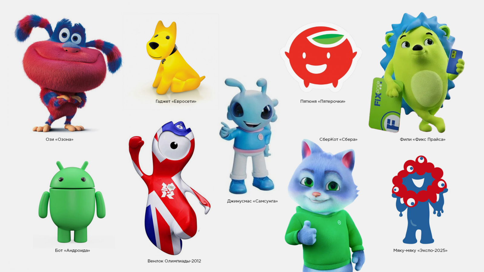 Бренд-персонаж (или маскот) — уникальное существо, зачастую антропоморфное, которое становится душой бренда, его постоянным представителем. Бренд-персонаж присутствует во многих ситуациях касания с аудиторией: от упаковки и сайта до соцсетей и мероприятий.