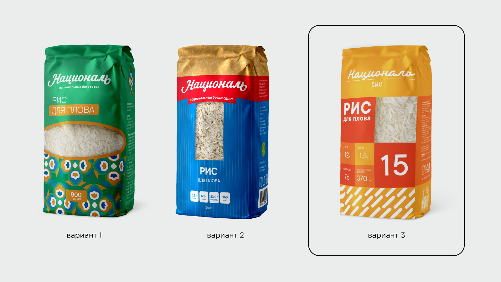 Первый, рациональный пример — проект с компанией «АФГ Националь». Агропромышленный холдинг — лидер на российском рынке круп, крупнейшая рисовая компания России и Европы — пришел к нам за визуальным обновлением своей торговой марки «Националь», в ассортименте которой крупы и большая линейка риса.
