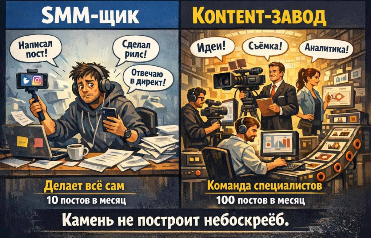 В этой статье разберём, почему SMM и контент-завод — это разные профессии, разные системы и разные результаты. И почему в 2026 году это различие стало критическим.