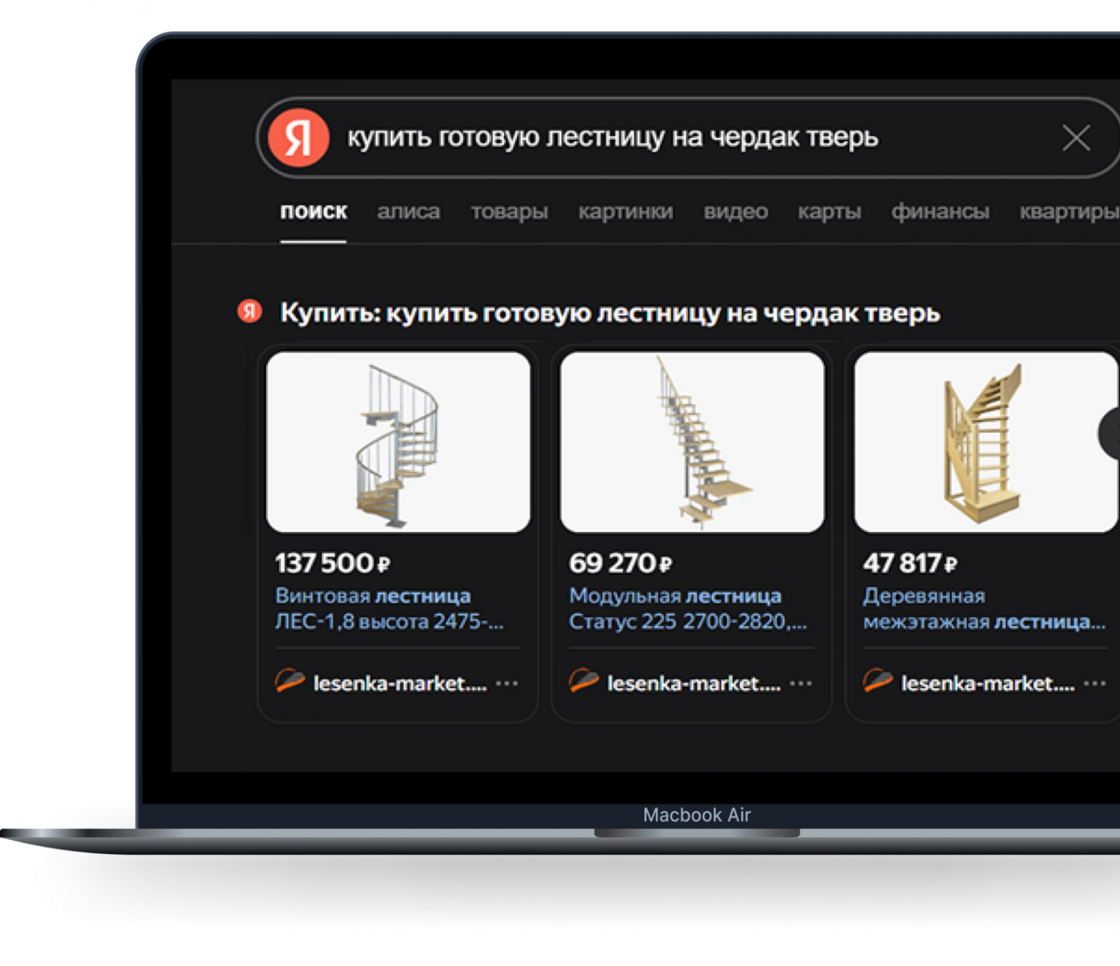 Первым делом была развернута товарная кампания (фид) с актуальным каталогом моделей лестниц. Это позволило немедленно привлечь трафик на популярные модели. Специально доработали текстовые элементы фида, чтобы товарные объявления выглядели привлекательно и информативно не только в галерее, но и в привычных местах выдачи поиска.